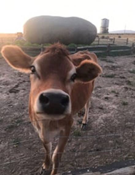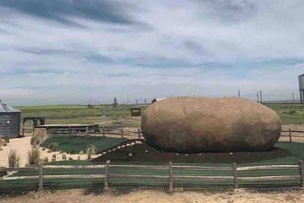 When they landed in Boise, a driver met them and took them out in the country and stopped by a huge potato! The driver helped them unload their luggage and then drove off and left them there! Kris and Kell were confused! All that was there was the huge potato, a round metal corncrib, and a brown cow standing in the field! They did not know what to do.